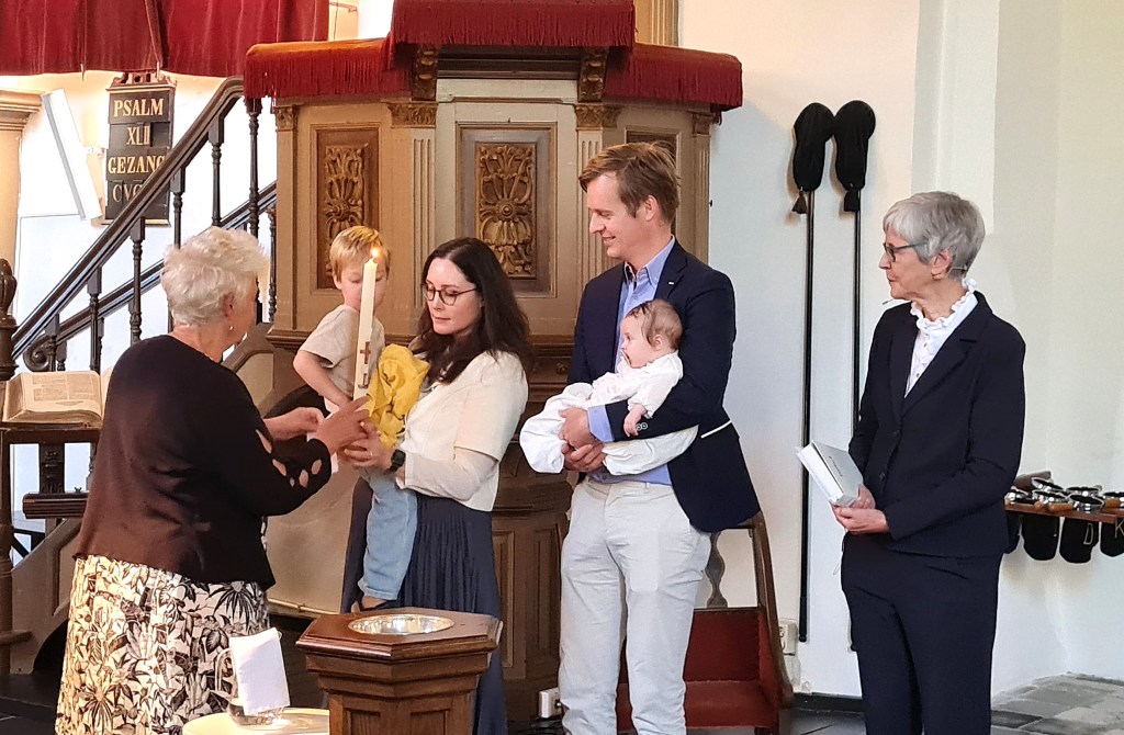 De kinderen mochten in de kapel knutselen. En bij de doop mochten ze allemaal vooraan zitten. Met elkaar zagen wij dat Hendrik hielp om het doopwater in het doopvont te gieten. Frederike Aleida Johanna haar naam werd genoemd en zij werd gedoopt. Staande beloofden de aanwezigen Frederike in de gemeenschap op te nemen. Na de dienst was er tijd om de ouders en beppe te feliciteren en was er tijd om elkaar te ontmoeten.