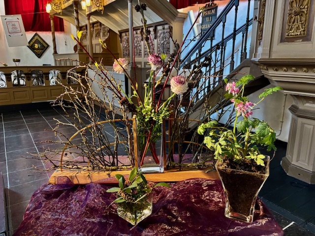 Bewogenheid, zorg voor elkaar en zorg om elkaar, daar gaat dit verhaal over. Handelen uit bewogenheid is als handelen uit liefde, het goede willen doen. In de grote vaas zijn daarom rode kornoeljetakken geplaatst. De sierlijke bloemen van het gebroken hartje lijken op verdriet en vreugdetranen. De geurende bloeiende bloemen van de skimmia versterken de onverwachte vreugde. In Azië is de symbolische betekenis van deze bloem liefde in verbondenheid. De bloemen van de rode scabiosa (duifkruid) zijn toegevoegd aan de takken als teken van liefde en de geest
