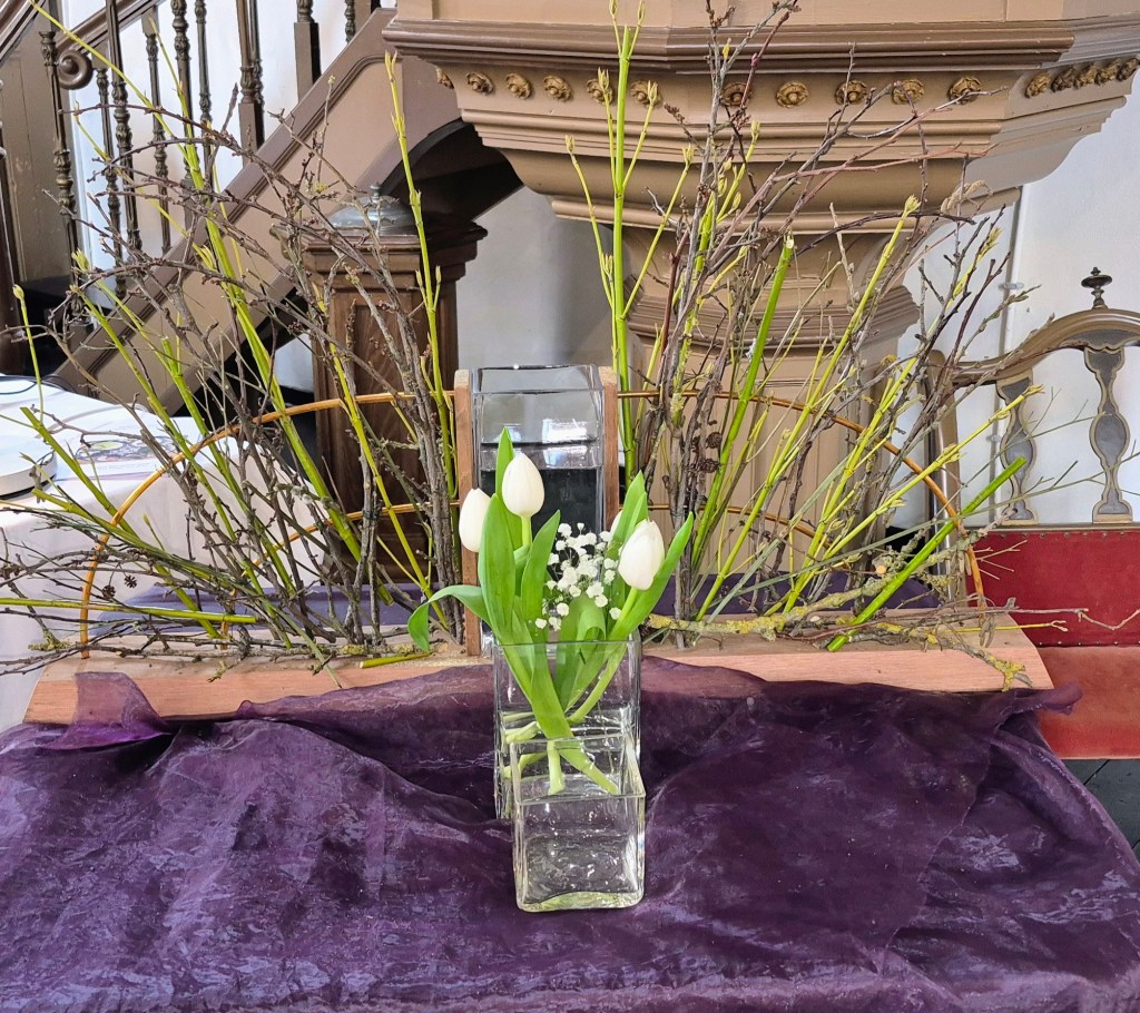 De voetwassing wordt gesymboliseerd met water, een (linnen) doek en bloeiende viooltjes. Het kleine viooltje wordt vaak geassocieerd met de drie-eenheid vanwege de drie kleuren, zoals bij de iris. In de middeleeuwse miniaturen in de Bijbel zie je vaak het viooltje getekend als symbool voor nederigheid. Het witte viooltje symboliseert het onschuldige, het zachtmoedige.