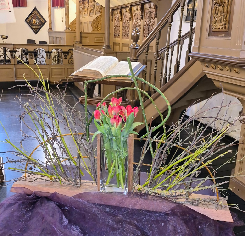 Voor de schikking zijn klassieke symbolen zoals doornen en de anemonen gekozen. Doornen om het lijden te onderstrepen. Een middeleeuwse legende vertelt ons dat de rode anemonen zijn ontstaan door bloeddruppels van Christus op witte bloemen toen Hij